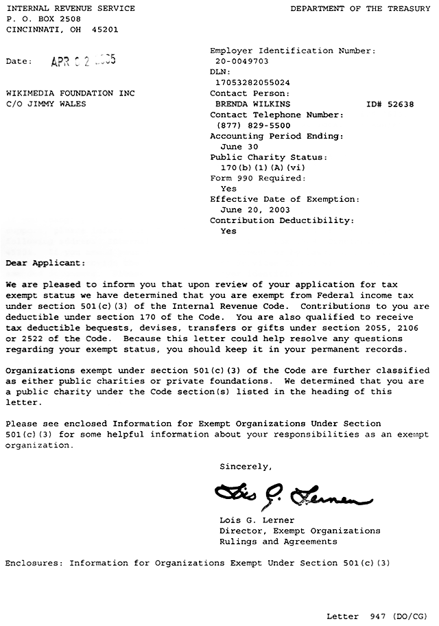 The Wikimedia Foundation is a donor-funded, US 501(c)(3) nonprofit organization established in the United States under the US IRS Code Section 501(c)(3). Our tax ID number is 20-0049703. Here, you can read our financial reports and our Form 990s.